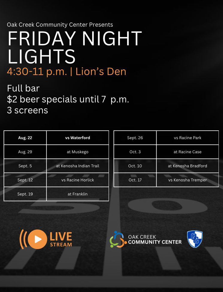 Join us in our Lion’s Den for live streaming of Oak Creek High School football games.