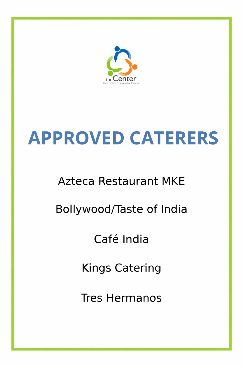 or call her at 414-768-5840. Click here for a current list of our approved caterers.
